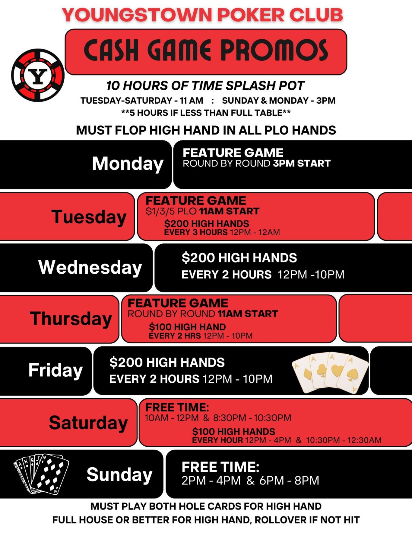 Daily Texas Hold'em tournaments and cash games. See our Schedule for Texas Hold'em, PLO, and Round-by-Round action every day.