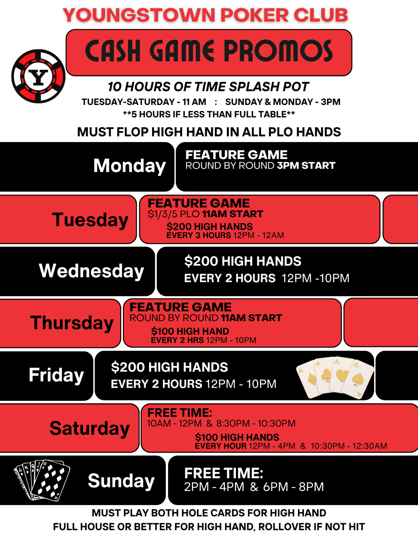 CASH GAMES - Texas Hold'em, Pot Limit Omaha (PLO), and Round-by-Round games offered daily. Check the Schedule for stakes and buy-in amounts.